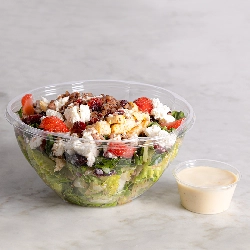 Ensalada Fresa Espinaca Mix de lechuga y espinaca con pollo (80 g) fresas, queso de cabra, arándano, nuez caramelizada y vinagreta de mostaza.