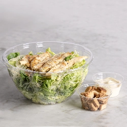 Ensalada César con Pollo Tradicional ensalada César con mix de lechuga, queso parmesano, pollo (100 g), crutones y aderezo César.
