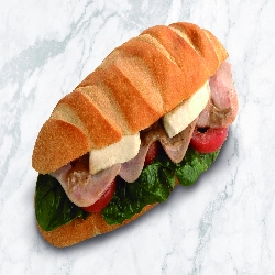 Viennoise Jamón Cabra Miel Pan Viennoise hecho con mantequilla francesa, relleno con jamón York (45 g), queso de cabra (40 g), espinaca baby, jitomate y aderezos de miel-mostaza y mayo-mostaza.(261g)