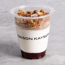 Yogurt con Zarzamora Yogurt con granola artesanal y dulce de frutos rojos hecho en casa.
